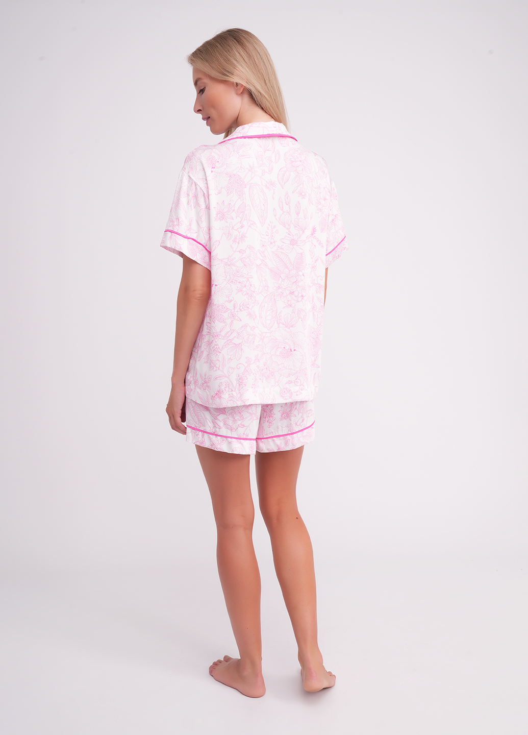 The set consists of a short-sleeved jacket and shorts, adorned with a delicate floral pattern and contrasting piping.