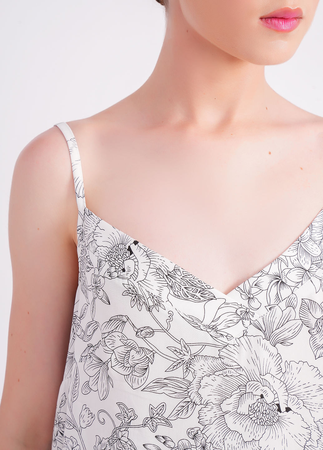 Das Oberteil ist ein Top mit schmalen, verstellbaren Trägern.